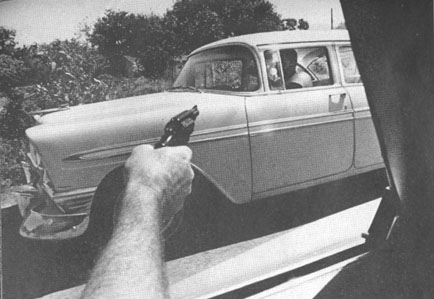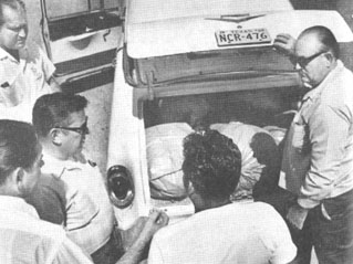 This bust was the climax of a bigtime smuggling case that began with an informer's tip: a quantity of marijuana was due to come across the Rio Grande at Laredo. Two nights later, agents hidden on the bank watched as several sacks were floated across in a raft made from two welded car hoods, then loaded into a car. They followed the car 150 miles to San Antonio where the driver turned it over to a buyer outside a supermarket. The buyer spotted the agents and sped off. At 50 mph the agents drew alongside (above), stopped him at gunpoint and clamped on the handcuffs (below). In the trunk of the car (right) they found $157,000 worth of pure Acapulco Gold.
