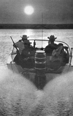At sunset, customs agents, armed with shotguns, scour the darkening waters of Falcon Lake, Texas—a favorite border crossing point for smugglers.