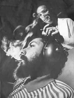 A test subject puffs on marijuana cigarette, research psychiatrist at Unversity of California applies electrodes to his head to monitor brain responses. Earphones record sensitivity to sound.