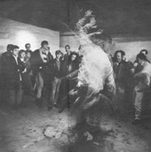 A pioneer in LSD use and research, Psychologist Timothy Leary, who was fired from Harvard after his early experiments, waits with daughter before Texas trial for smuggling marijuana. At right, Los Angeles "acid heads" (LSD users) and spectators watch member of troupe called the Acid Test dance under the influence of the drug, using flashing lights to heighten its effects. Below, a girl sits enraptured in an LSD hangout.